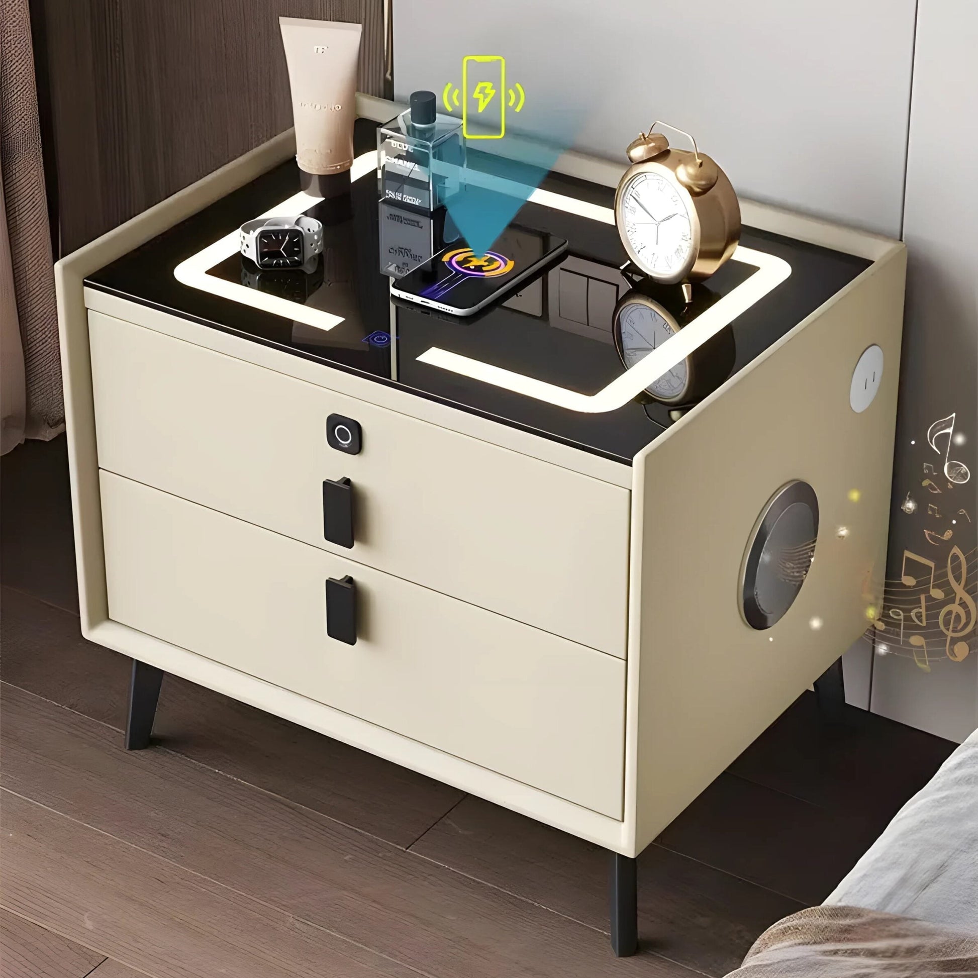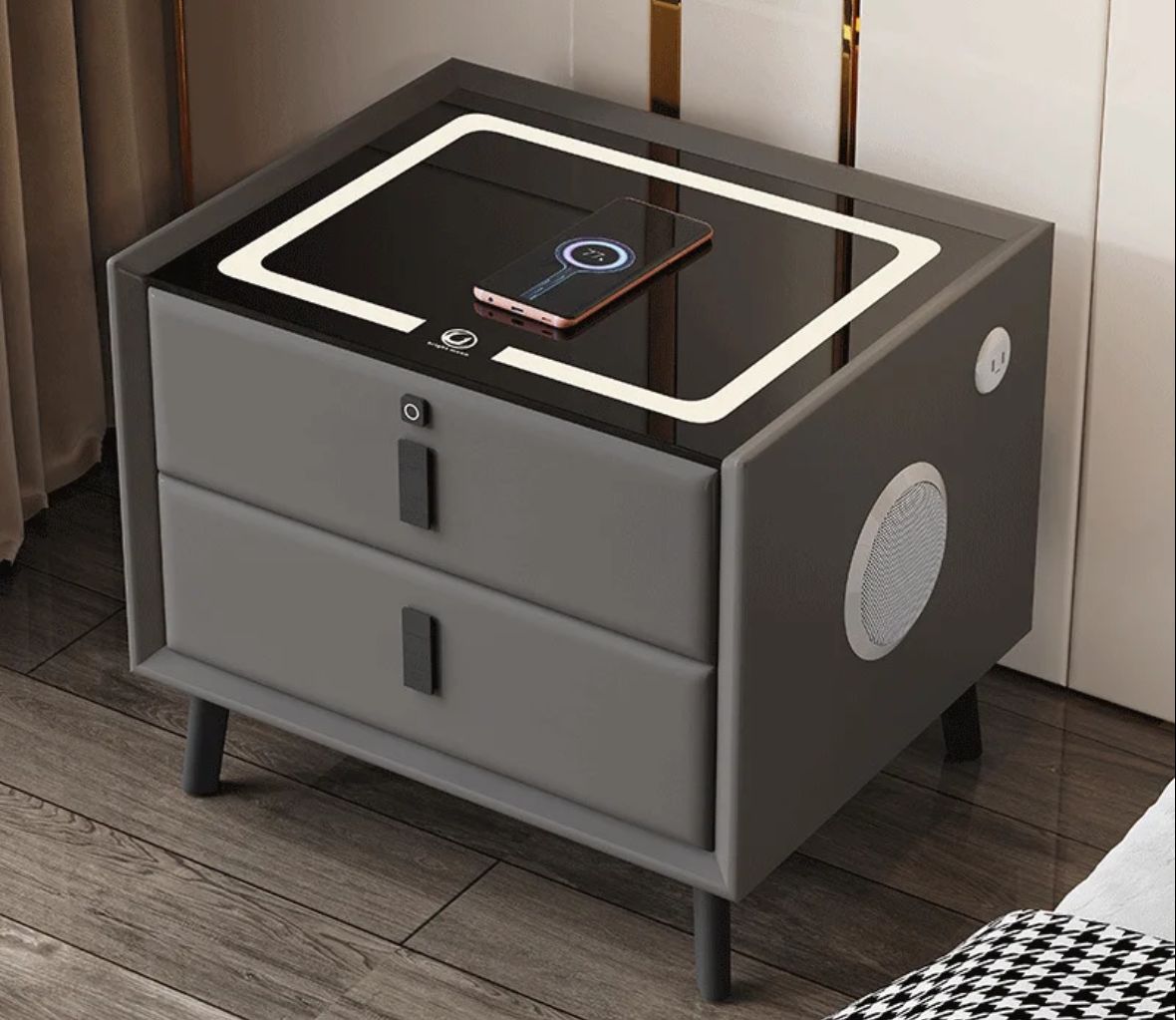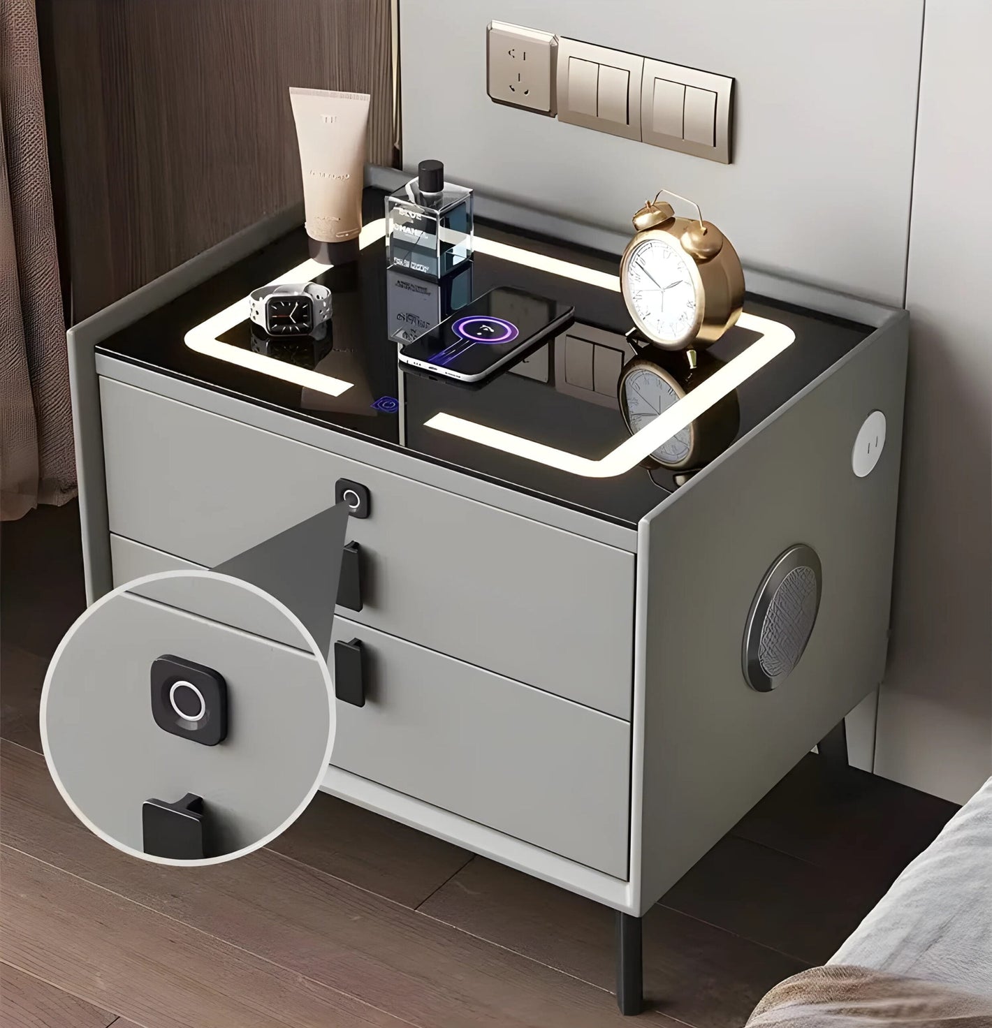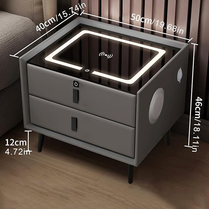 שידת לילה חכמה-עם 2 רמקולים, וטביעת אצבע, שתי מגירות, ותומך טעינה אלחוטית