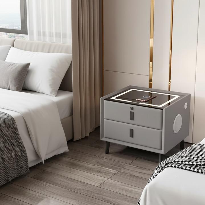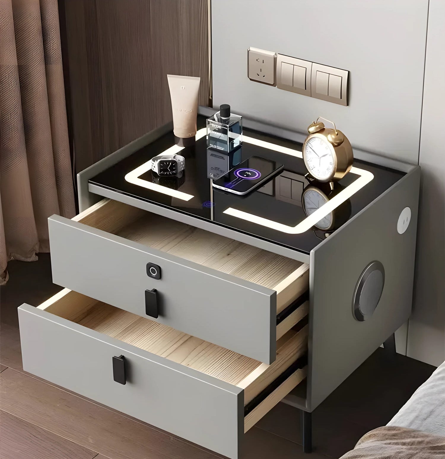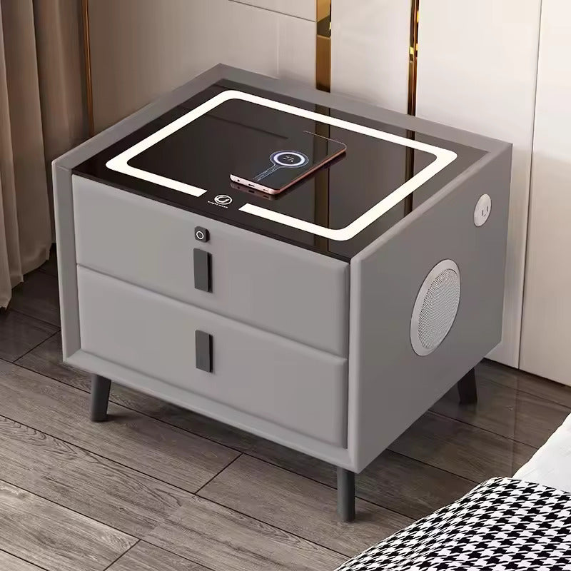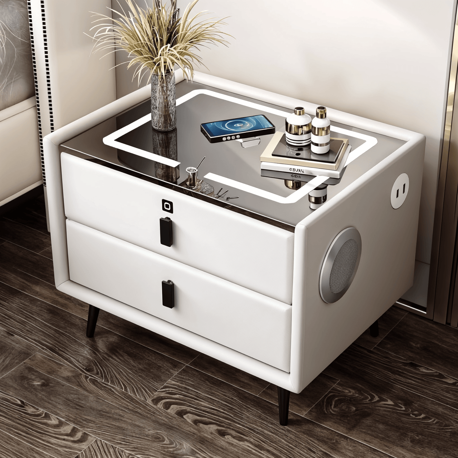 שידת לילה חכמה-עם 2 רמקולים, וטביעת אצבע, שתי מגירות, ותומך טעינה אלחוטית