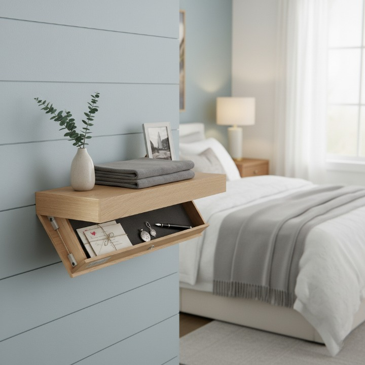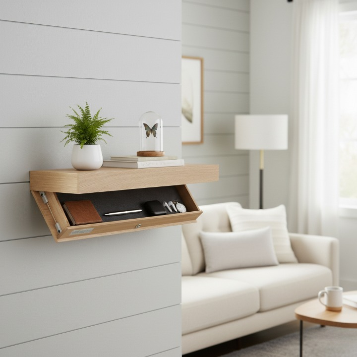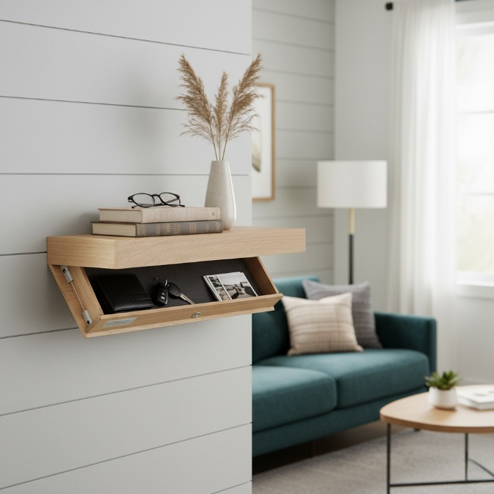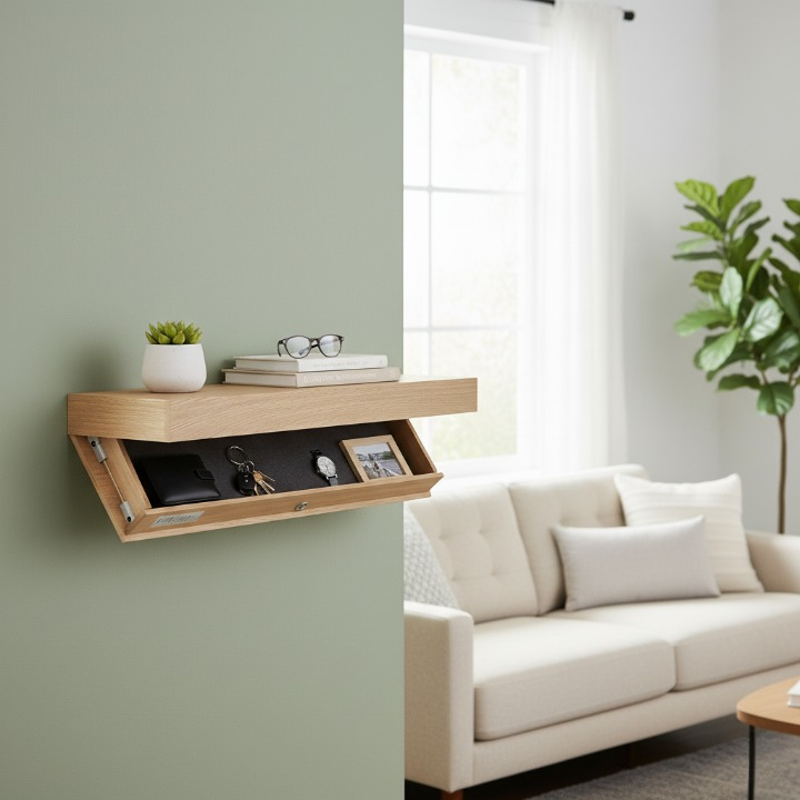 מדף צף קיר מעץ מלא עם תא סודי וכרטיס לפתיחה (90*28*8 ס"מ)