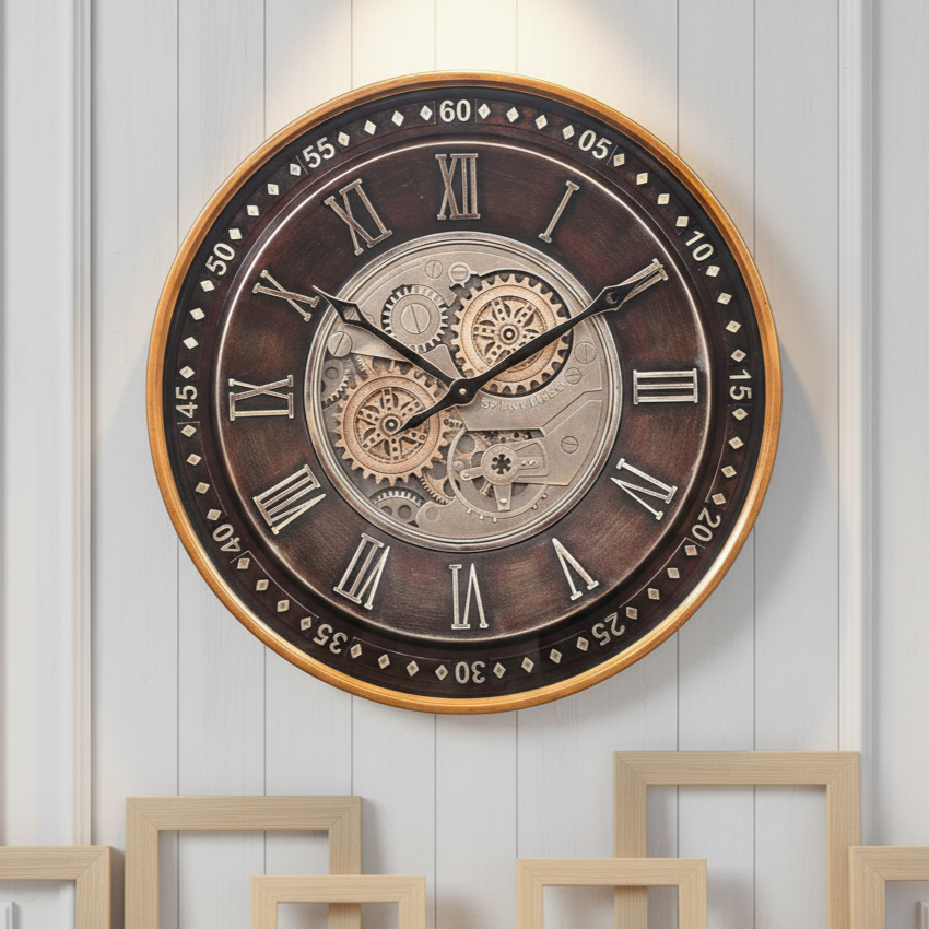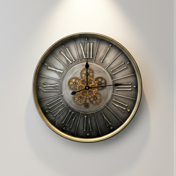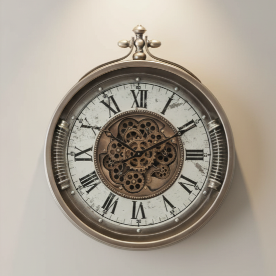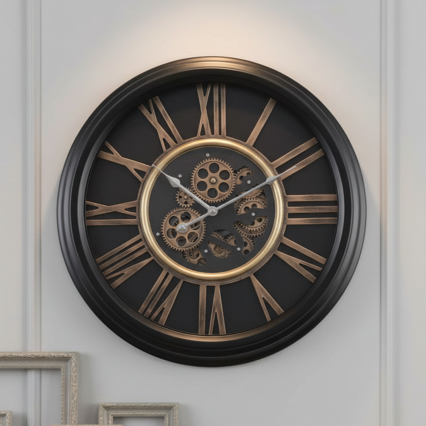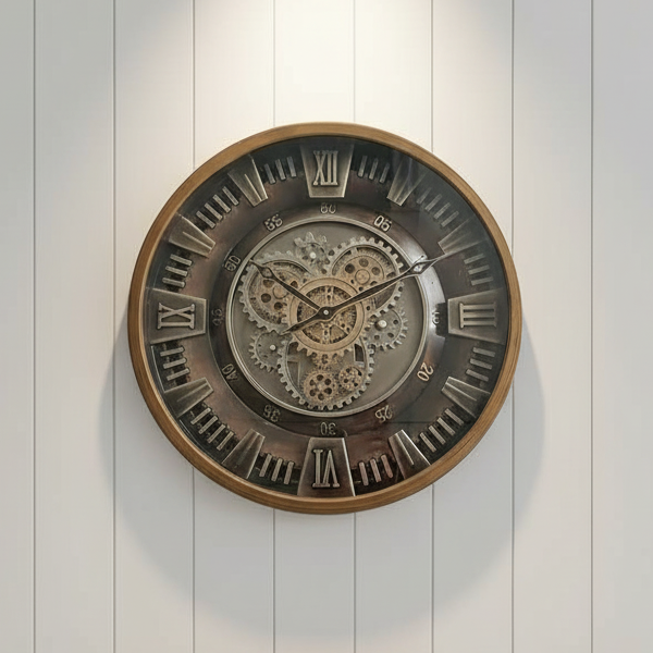 הוא מחוספס אך מעודן. המסגרת הכפרית מברזל יצוק וגימור המתכת העתיק המעובד מעניקים לו מראה תעשייתי גולמי, המאוזן באופן מושלם על ידי ספרות רומיות מוזהבות ואלגנטיות, המנצנצות בעידון.