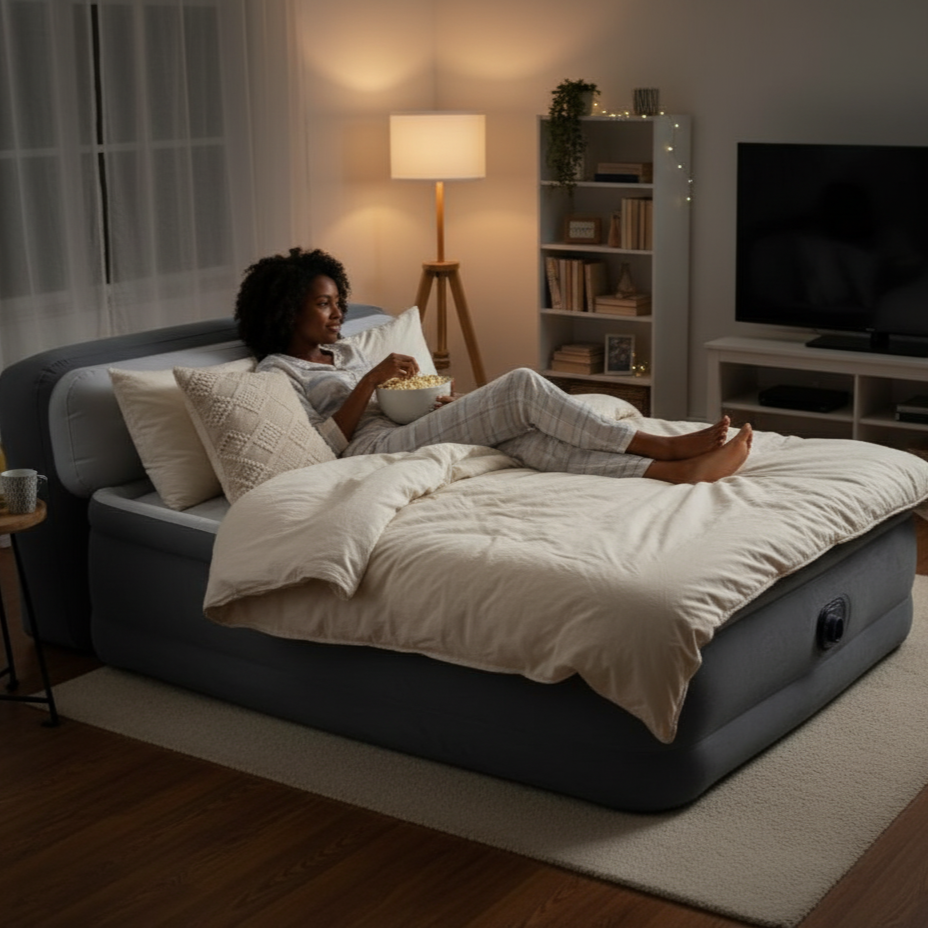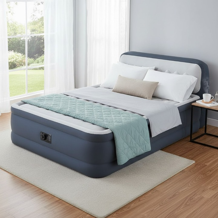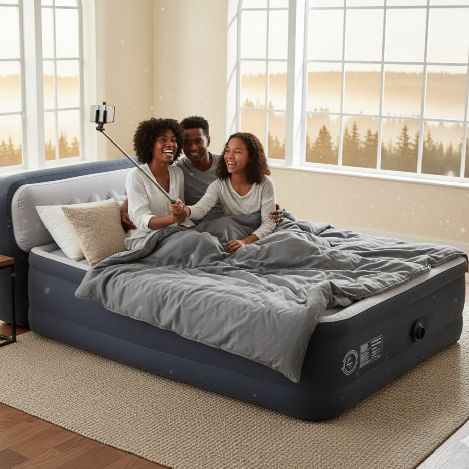 מזרן מתנפח בגודל קווין סייז זה קל לאחסון ומגיע עם תיק נשיאה — מושלם לאורחים, לטיולי קמפינג או אפילו לערבי סרטים. זהו נוחות שמתאימה לכל מקום שהחיים לוקחים אותך.