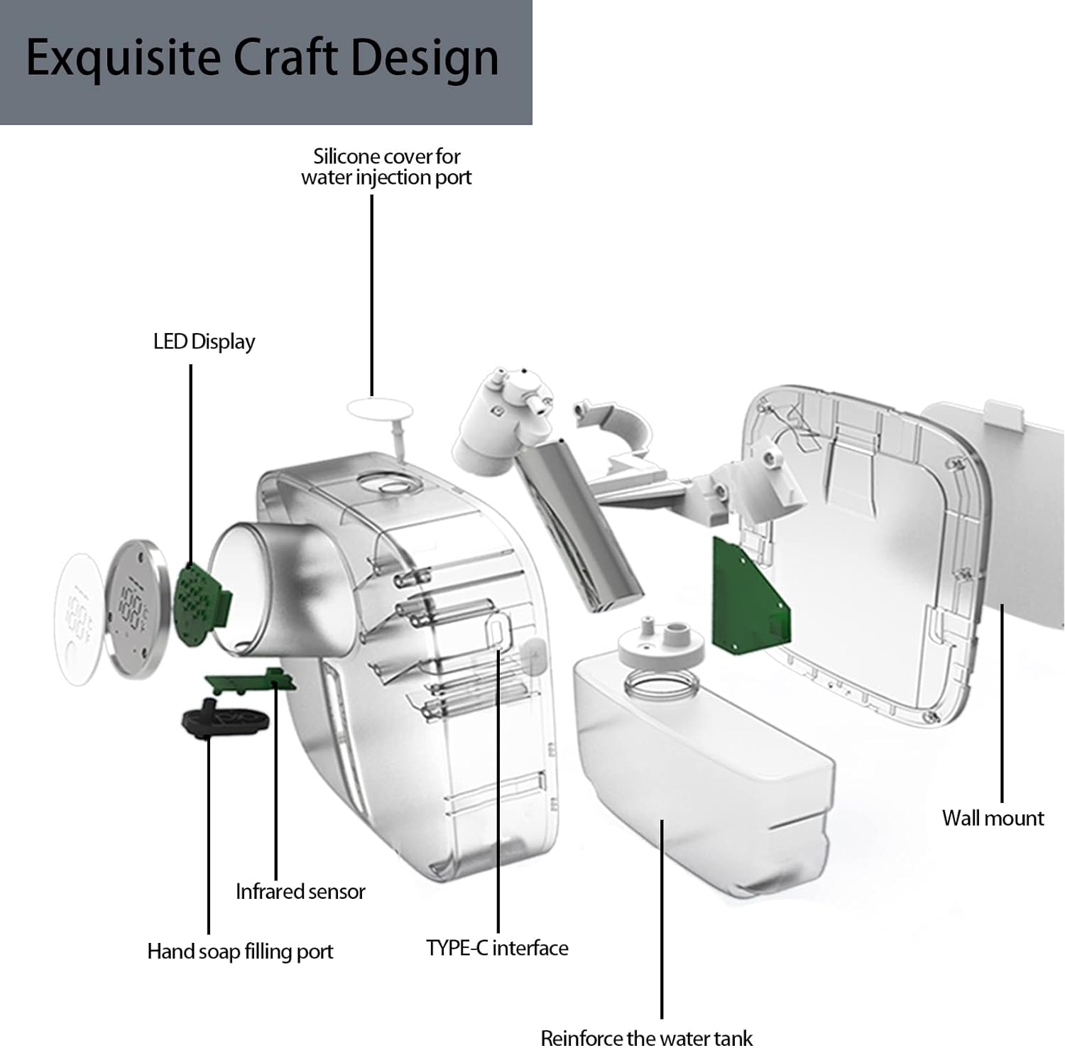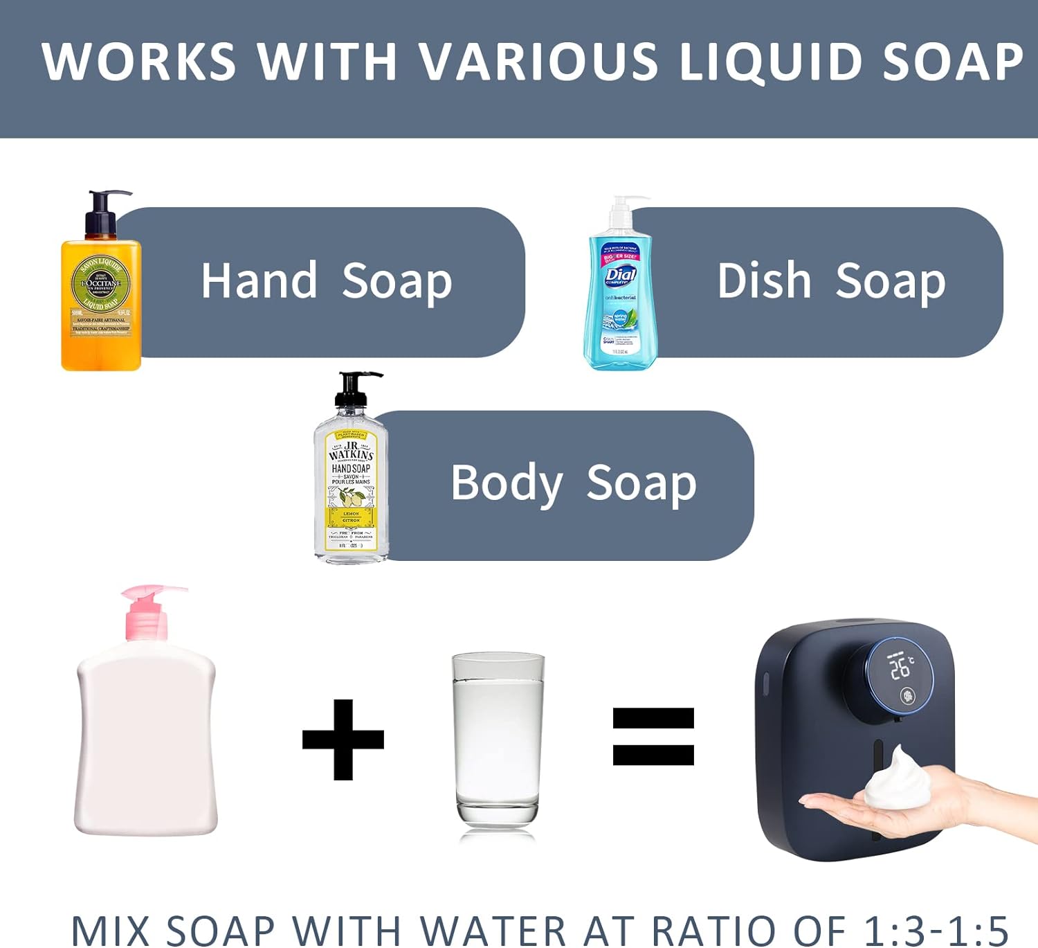 【מסך מלא】 התכוננו להתרגש מהתצוגה על המסך המלא של מתקן הסבון הזה! זה מראה לך כמה כוח נשאר ואפילו את הטמפרטורה הפנימית. בנוסף, הוא עמיד למים (IPX5), כך שתוכל להשתמש בו בסביבות לחות מבלי לדאוג לנזק. רק הקפד לשמור על החיישן יבש! 【תואם עם סבונים שונים】 לא משנה איזה סוג סבון אתה מעדיף - סבון ידיים, סבון כלים או שטיפת גוף - המתקן הזה יכול להתמודד עם הכל. בנוסף, עם הקיבולת הגדולה של 12 oz/300 מ"ל, אתה יכול להשיג עד 500 שימושים, שאמורים להחזיק את המשפחה שלך למשך כ-50 ימים. (יש לדלל סבון ג'ל רגיל במים, ניתן להוסיף סבון קצף ישירות)