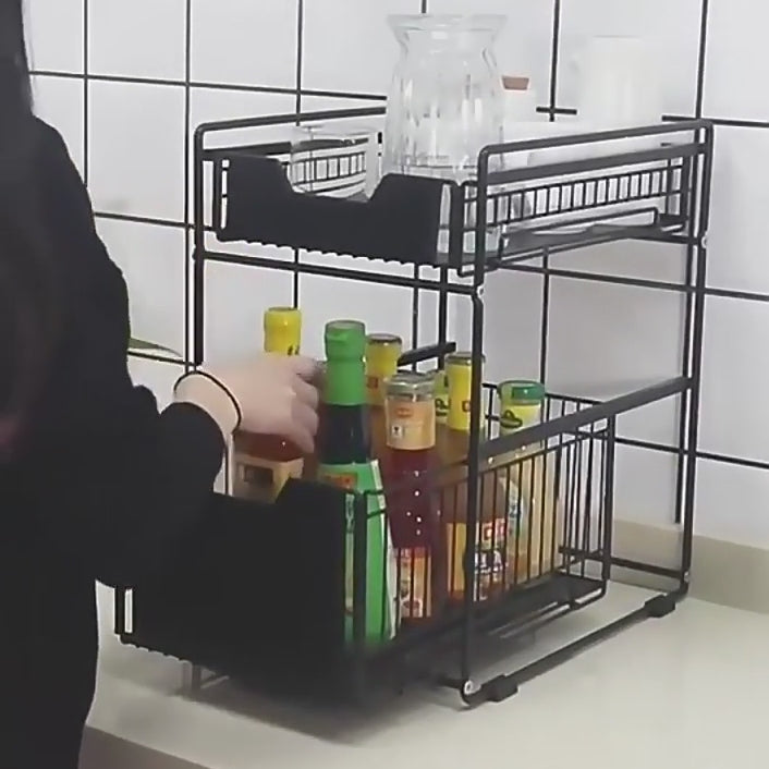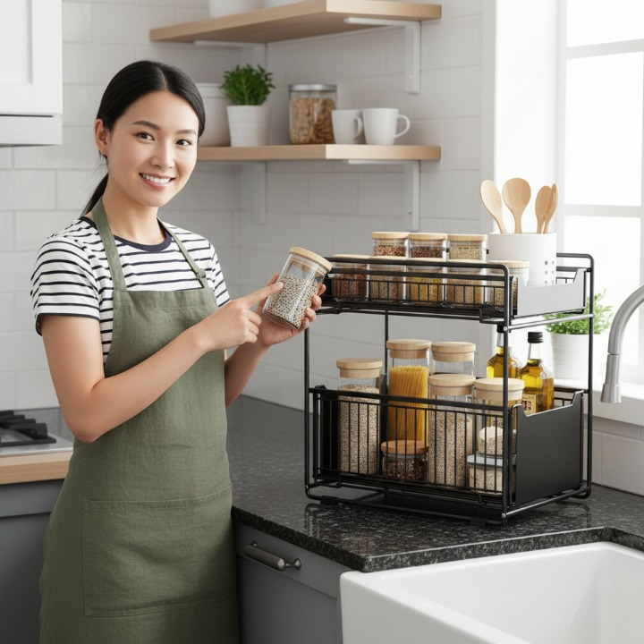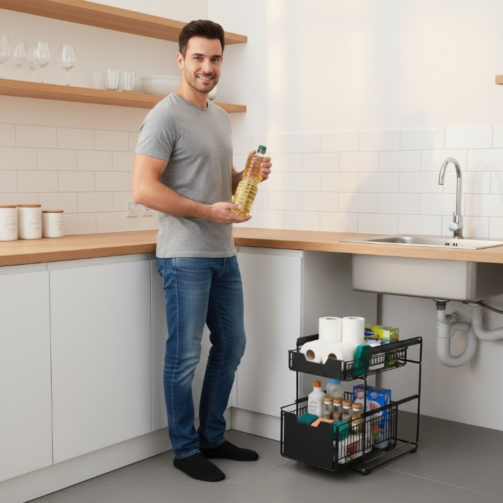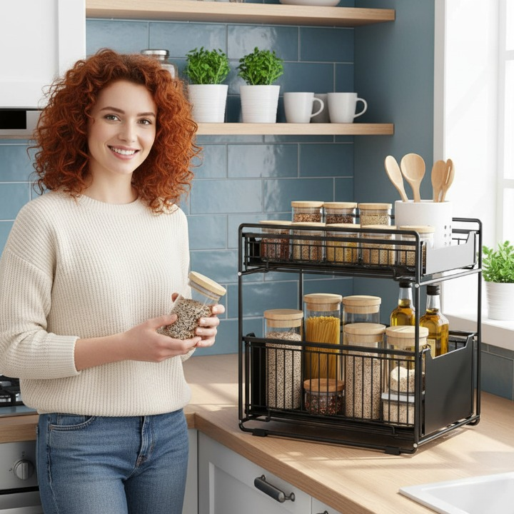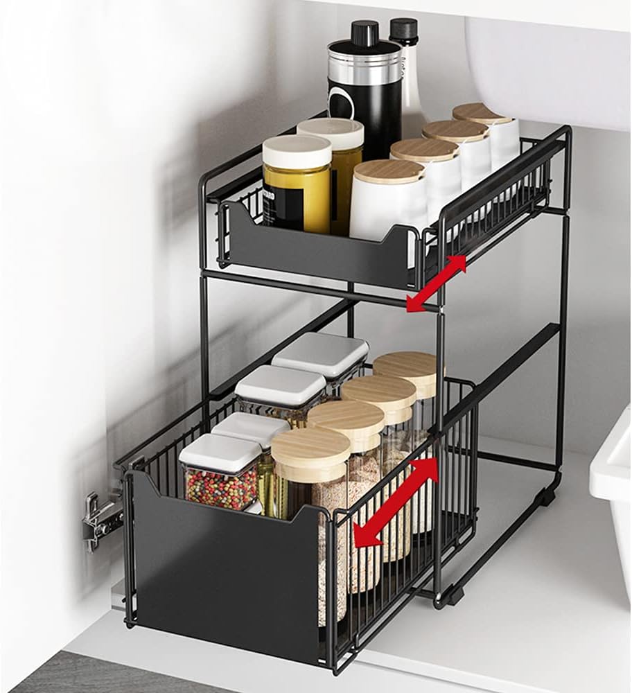 נצלו את החללים הצפופים בצורה מיטבית! העיצוב הזז הדו-קומתי מוסיף באופן מיידי שטח אחסון אנכי מתחת לכיור, על משטחי העבודה או בתוך הארונות — והופך פינות מבוזבזות לאחסון מסודר.