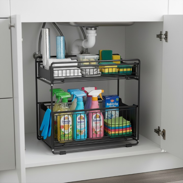 פעם פחדתי לפתוח את הארון מתחת לכיור — הבקבוקים היו נופלים החוצה בכל פעם! המעמד הזה שינה הכל. עכשיו הכל מסודר, קל למצוא, ונשאר במקום.