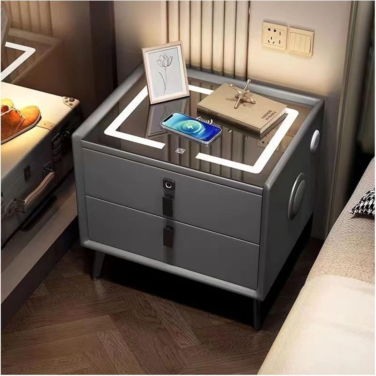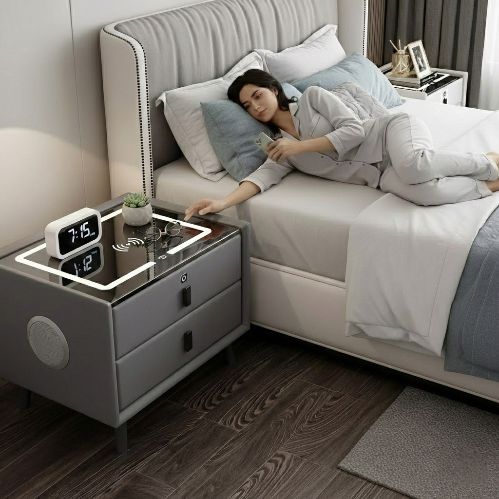 שידת לילה חכמה 2 רמקולים, וטביעת אצבע, שתי מגירות, ותומך טעינה חכמת