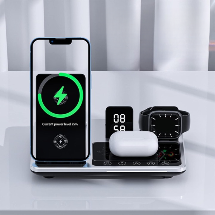 טעינה חכמת 4 ב-1 מגע לסמארטפונים (iOS ואנדרואיד), חכמים ואוזניות תחנת שיחות עם שעון דיטלי מובנה ותצוגת LED