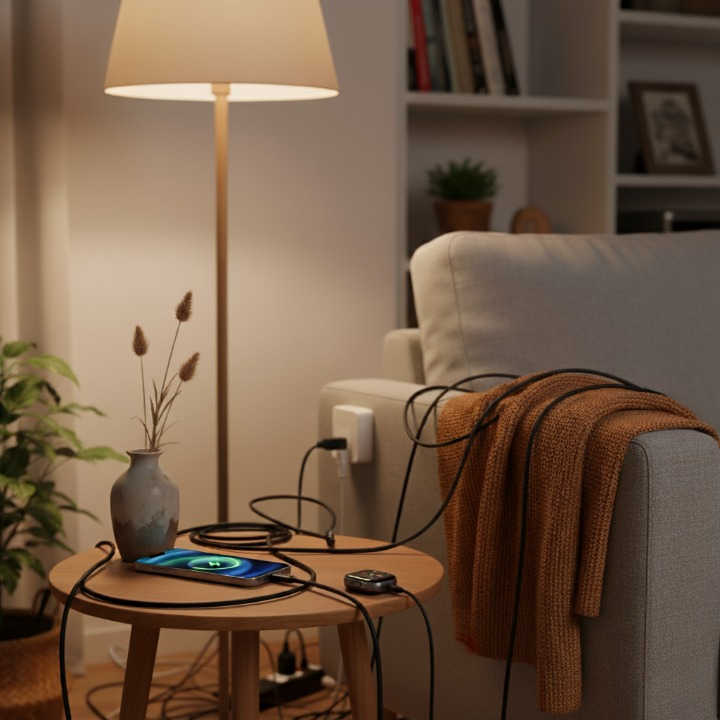 פעם היו לי מטענים וכבלים בכל מקום — זה נראה כמו ג'ונגל טכנולוגי. עכשיו, הכל מסודר, זוהר ברכות ומטען. הבקרים שלי מרגישים רגועים יותר.